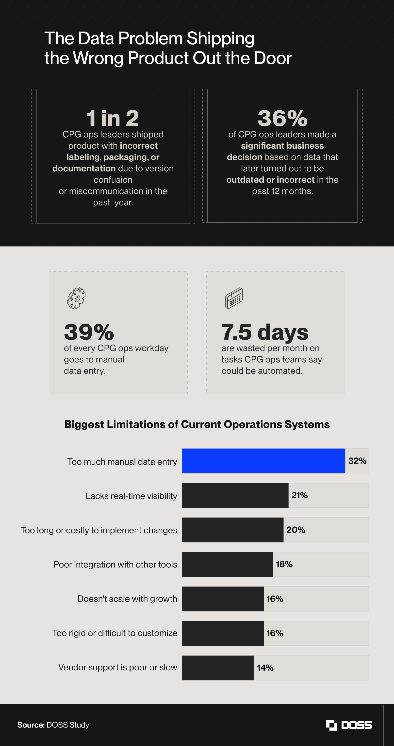 Rising costs, supply chain volatility, and tougher retail expectations have made consumer packaged goods (CPG) operations harder to run with patchwork systems and manual workarounds. To understand where teams were actually getting stuck, DOSS surveyed 230 U.S.-based operations, supply chain, and manufacturing leaders at CPG and physical goods companies in 2026.