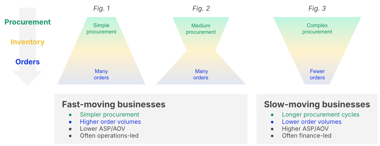 Fast-moving businesses (e.g. e-commerce, food & beverage) need real-time inventory tracking, automated reorder points, and streamlined order processing (Figure 1). They process high volumes of orders that are typically fulfilled within days, often with lower ASP and AOV (aka average selling price and average order volume, respectively). Depending on business complexity, procurement may involve a slightly wider funnel of incoming parts and suppliers to fulfill a wider variety of product lines and SKUs (Figure 2).
