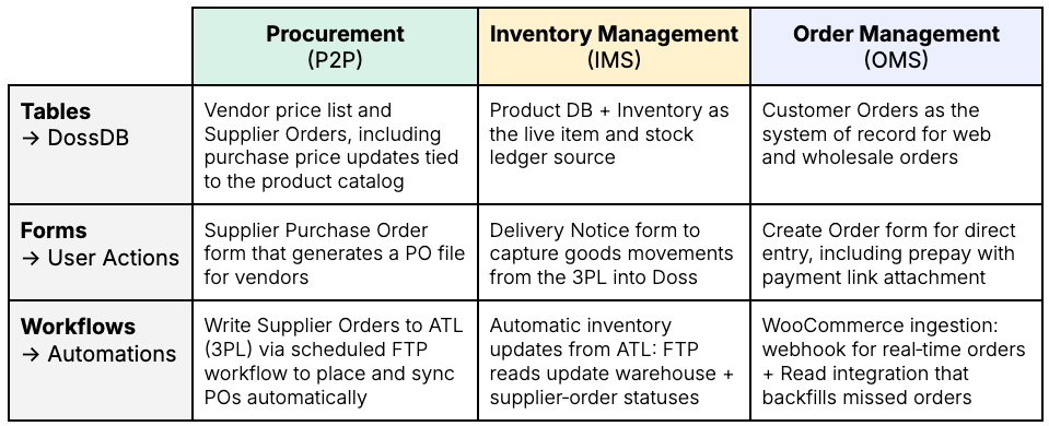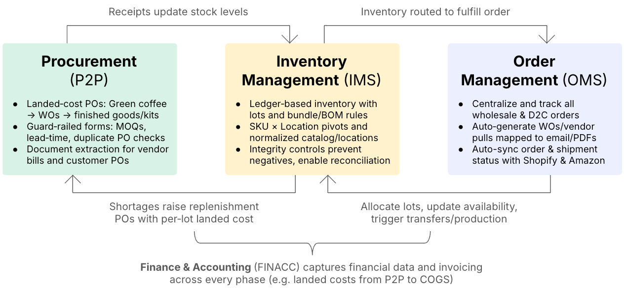 For example, Kahawa 1893 , a specialty coffee company, achieved 30x faster order processing by fully integrating and automating processes with DOSS. Here’s how Kahawa coordinates operations across P2P, IMS, and OMS modules: