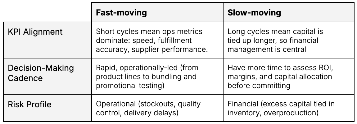While these patterns are common, exceptions abound: A slow-moving business might be operations-led if it’s in a highly service-dependent industry (e.g. custom aerospace), while a fast-moving business may be finance-led if operating in thin-margin sectors (e.g. discount retail).
