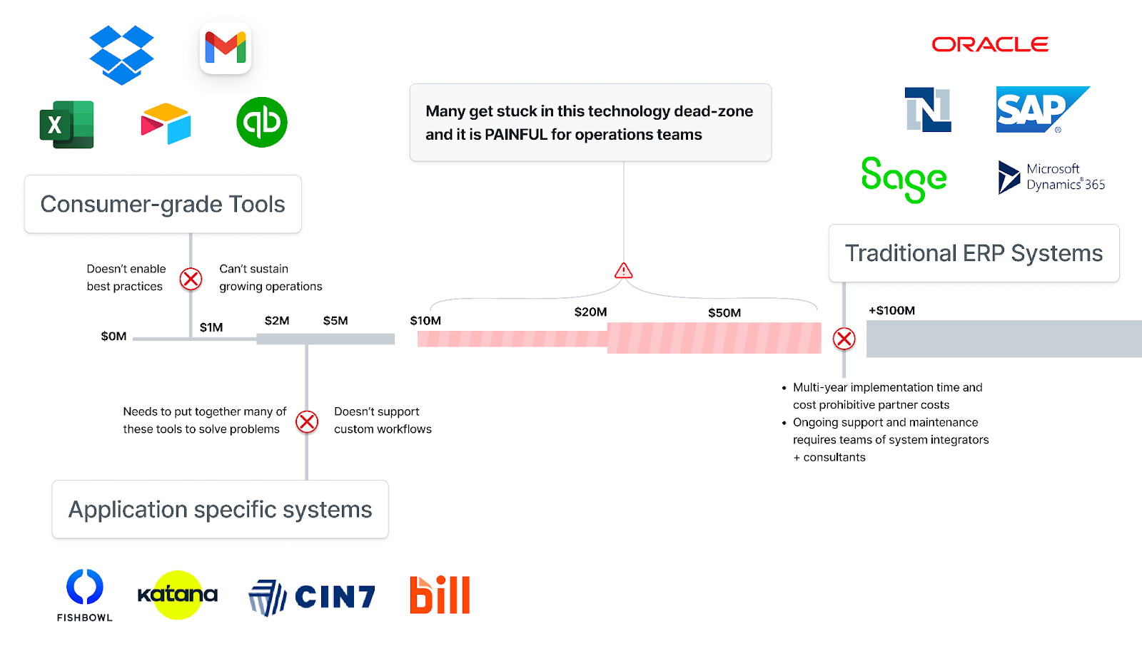 So many companies don't have a viable option because they've outgrown spreadsheets, but ERPs are just way too risky to implement. They’re stuck between a rock and a hard place and the future of their company is at stake.‍