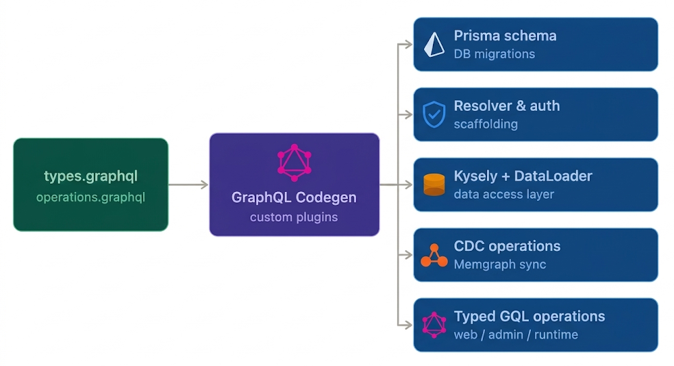 From one set of GraphQL files, we generate the core runtime surfaces of the platform: database models, resolver contracts, data loading boundaries, graph sync types, typed client operations, and migration metadata.