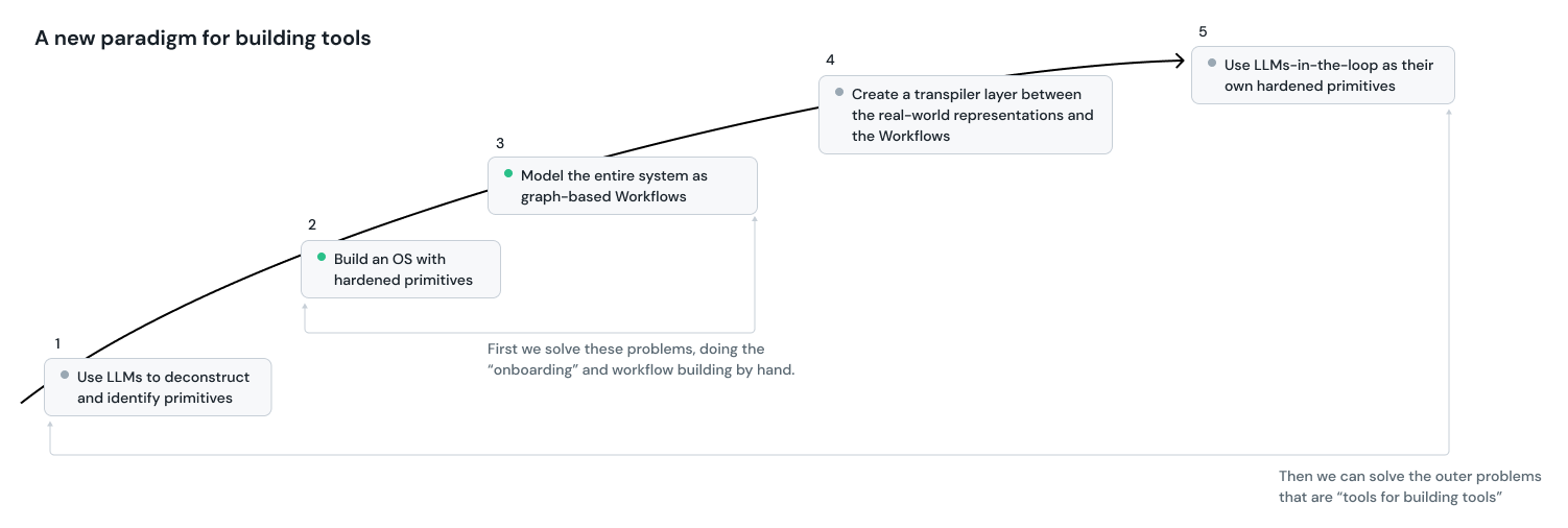 - Next, we build the "the machine that builds the machine" (#1, #4, #5 from above). This will require clever fine-tuning and data infrastructure to allow for state-of-the-art language models to be able to reference the syntax of our primitives as if it were just another programming language.