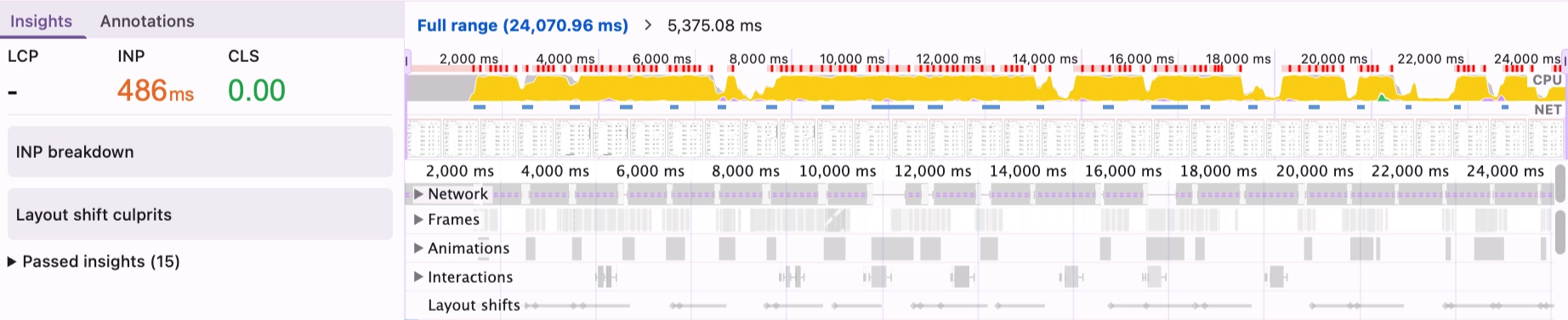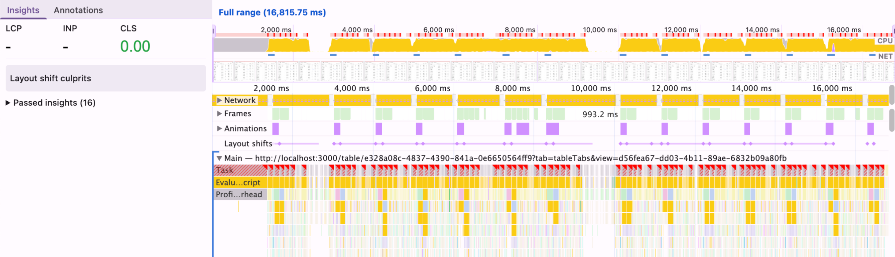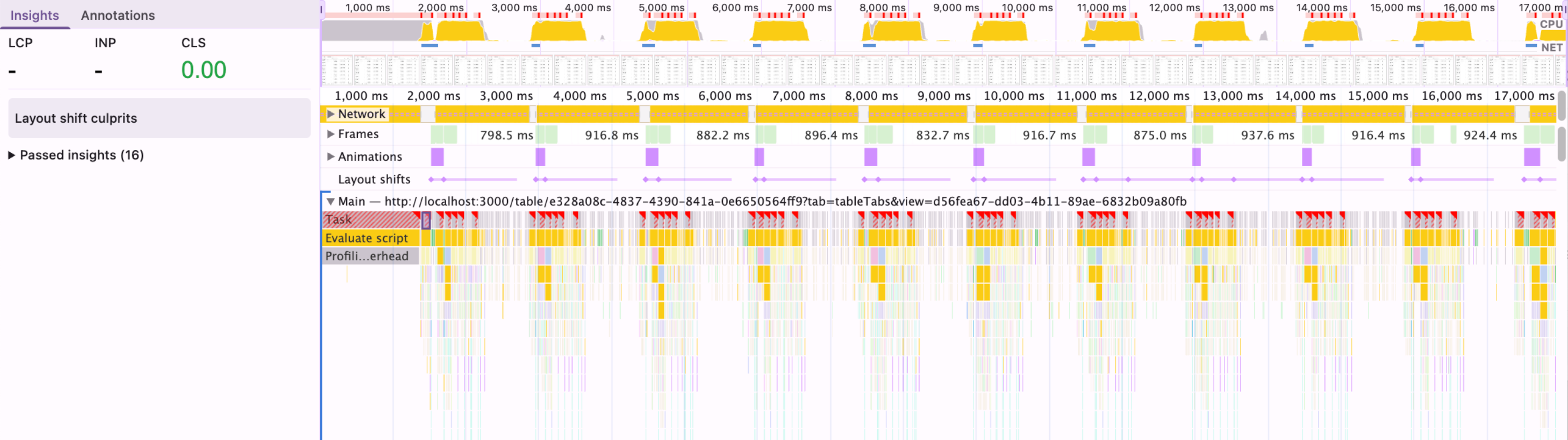 Within seconds of opening the page, it was nearly impossible to interact with anything: editing cells, switching tabs, even just navigating off of the page. A quick look at DevTools showed a steady 100% CPU, sometimes for as long as 10 seconds at a time.
