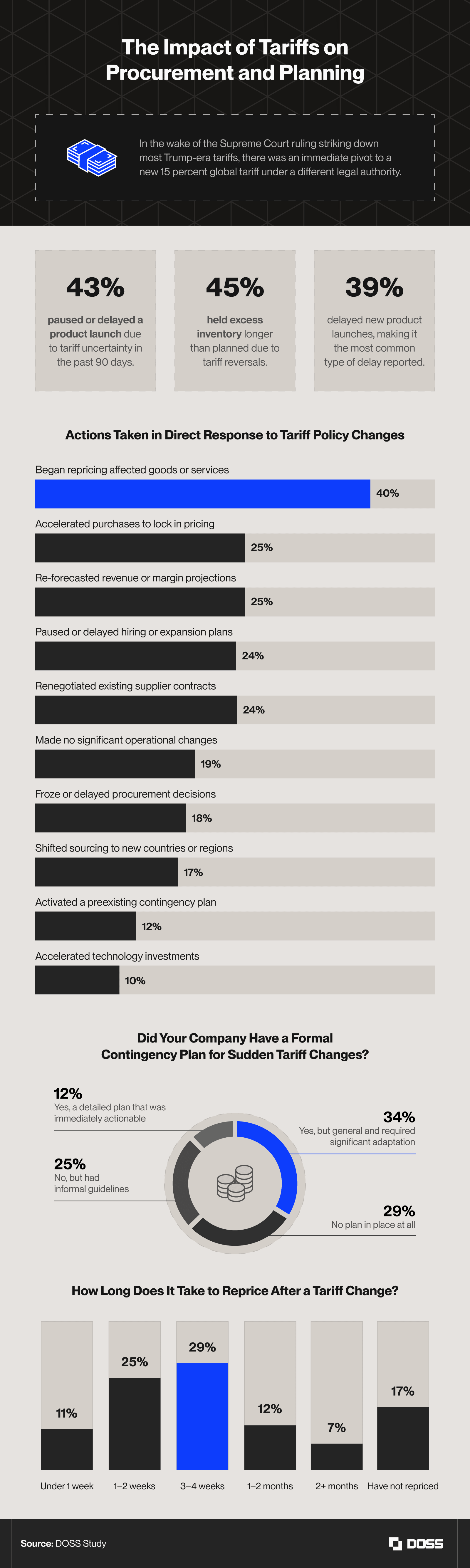 - Only 11% say their companies can reprice goods in under a week after a tariff change. In contrast, 48% report it takes three weeks or more, and 17% say their companies have not repriced at all.